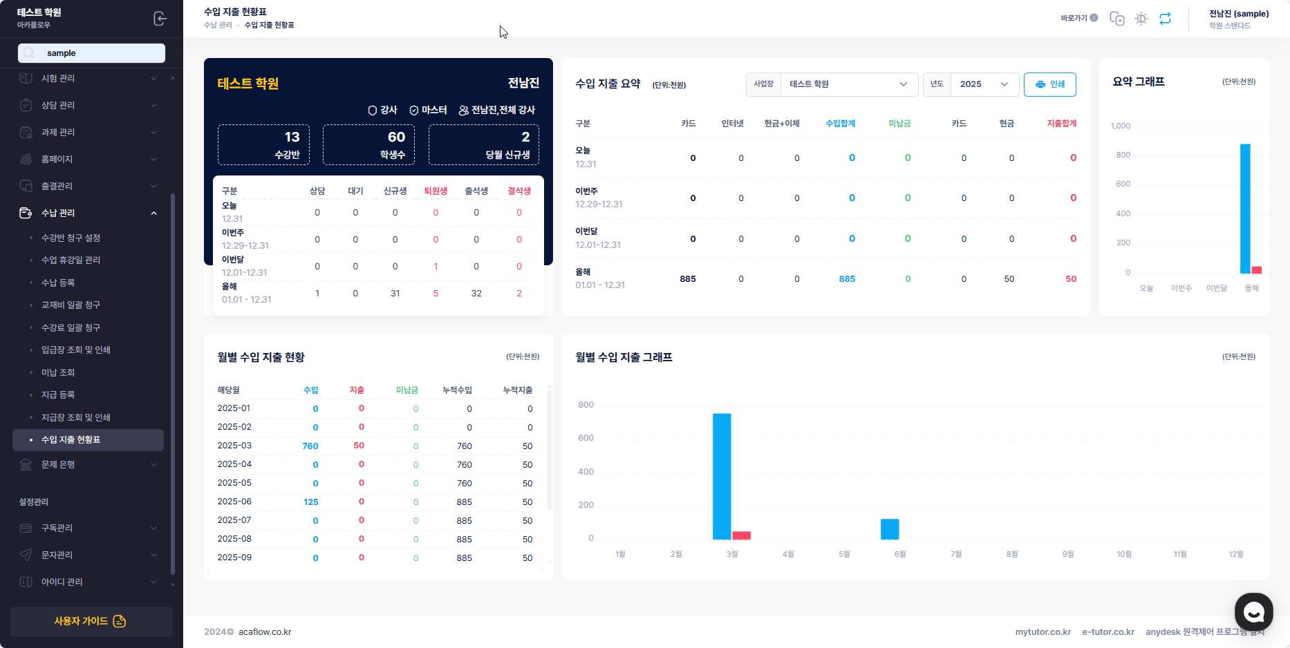 학원 수강생 추이 지표 및 수입/지출 현황을 확인할 수 있는 통계자료입니다
