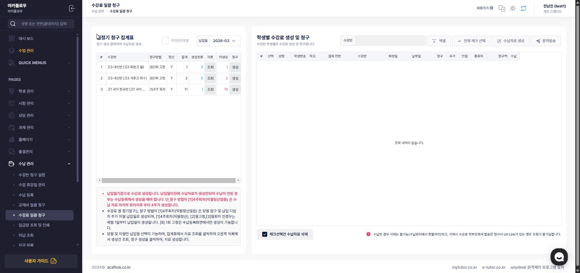 학생별로 수강료 생성시 주의 사항을 안내합니다.