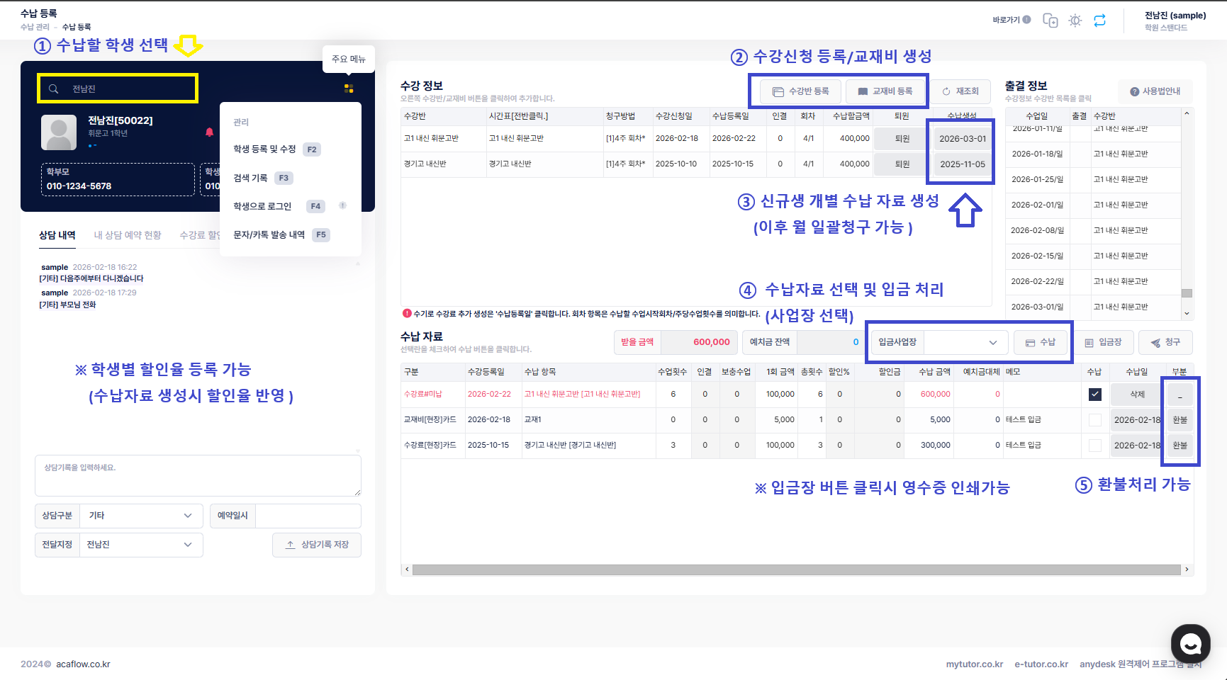 수강생별로 조회하여 수납 자료(수강료, 교재비 등) 생성을 하고 입금 처리를 합니다.