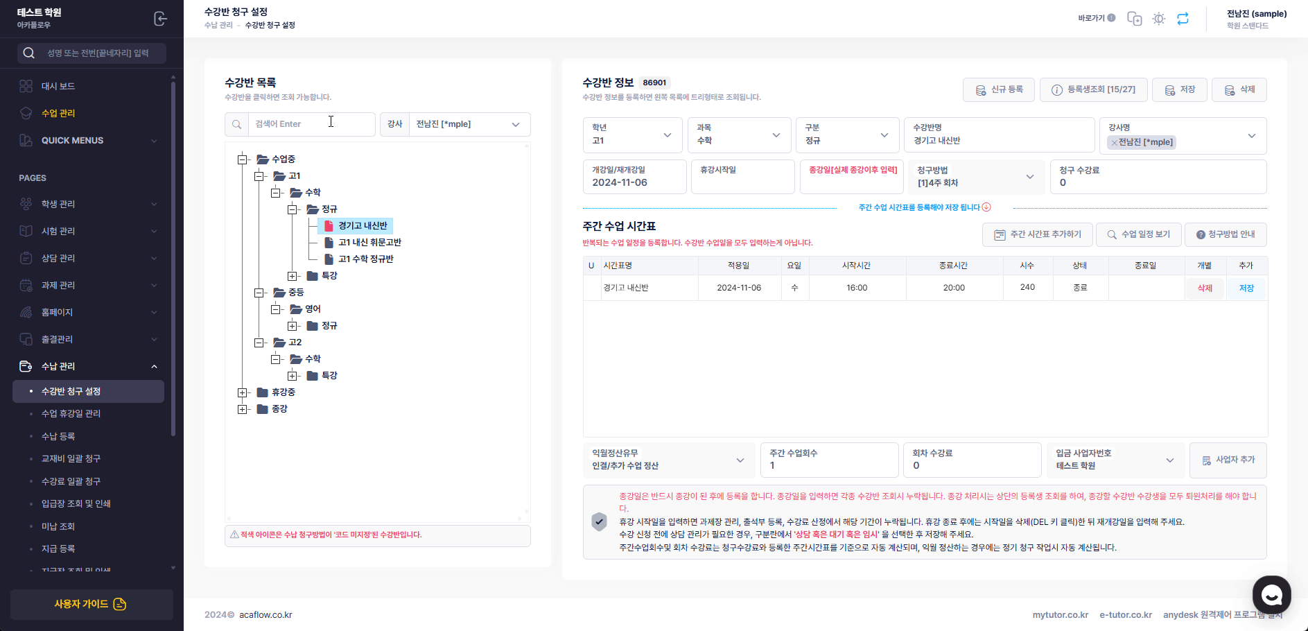 - 예시: 고3 수능 정규수업을 월요일에는 A 학원에서, 일요일에는 B 학원에서 진행할 경우, 각각 "A학원 월요일반"과 "B학원 일요일반"으로 등록합니다.
